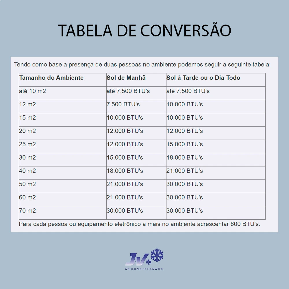 Tendo como base a presença de duas pessoas no ambiente podemos seguir a seguinte tabela abaixo:Se preferir realizar um cálculo mais personalizado pode-se utilizar a regra de 600 BTU's por m² (metro quadrado) para até duas pessoas, e mais 600 BTU's por pessoa ou equipamento que emita calor no ambiente. Por exemplo, em um quarto de 12m² em que durmam duas pessoas e possua um aparelho de televisão que fica ligado durante boa parte da noite, o cálculo seria: 12m² x 600 = 7200 + 600 = 7800 BTU's.
